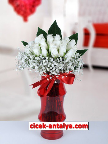 Kırmızıyla beyazın mükemmel buluşması KÜRESEL ÇİÇEKTE… Cam vazoda beyaz güllerle sevginizi ancak bu kadar güzel anlatabilirdiniz.