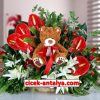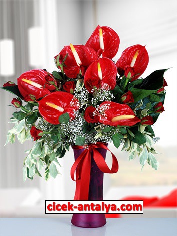 Karşı konulmaz bir tutku vazo içerisinde kırmızı antoryumlar ve onların zerafetine eşlik eden kırmızı gül ve yeşillikler… Bu aranjman sevdiklerinizi büyüleyecek…